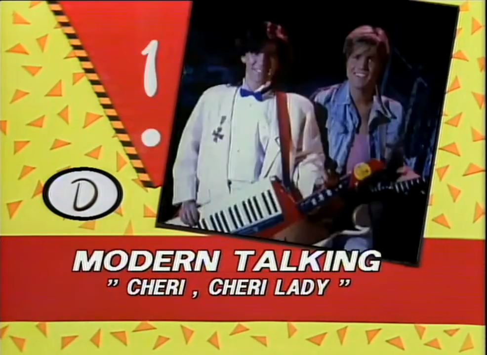 | 99 | 14.10.1985 | D 1: MODERN TALKING - Cheri Cheri Lady [Interview und Preisuebergabe] | Dieter Bohlen |